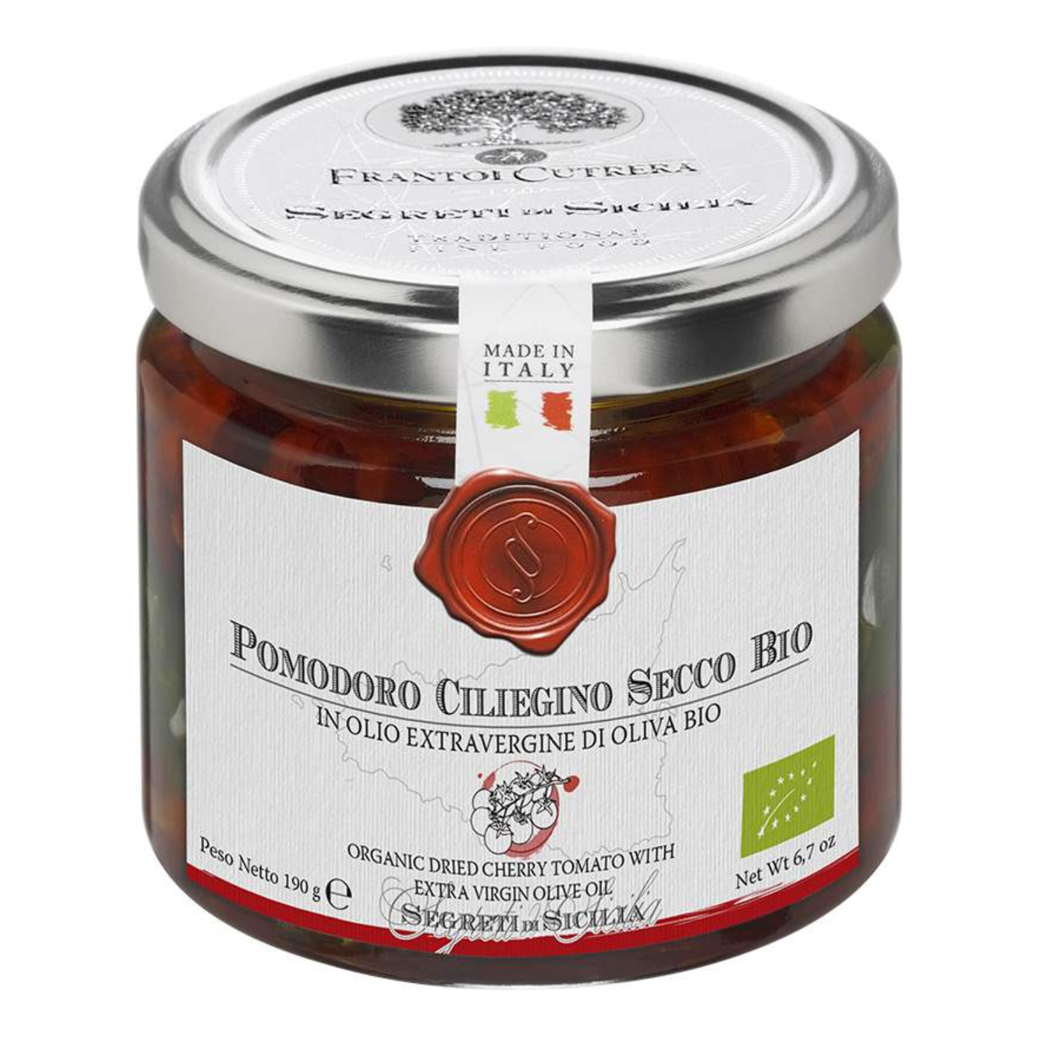 Organic sun-dried cherry tomatoes preserved in oil, offering a sweet and intense flavor
